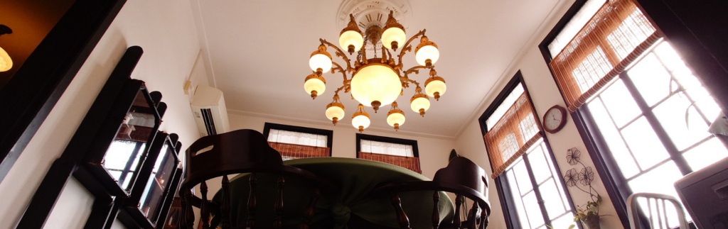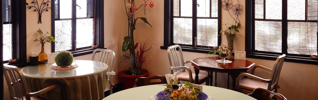 室内にある特徴的なシャンデリアはレトロで大正ロマンを思わせる雰囲気で、この建物と同じ時代に現役だったものです。またカフェサロンの空間に流れる音楽も建物と同じ時を記録したオールドレコードを聞くことができます。タイムスリップしたような空間でくつろぎの時間を過ごしてみてはいかがでしょうか。