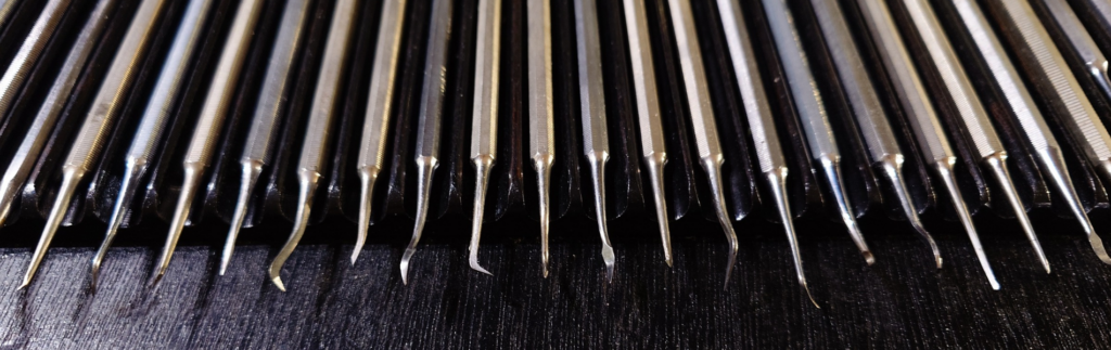 アトリエの以前の姿は歯科医でした。歯科と彫金。一見、まったく違う二つの職業には不思議な共通点があります。例えば制作する時に使う道具です。歯科で使用する歯垢を削ったり詰め物を詰めたりする道具や歯を削る電動工具などが、同じく彫金の作業でも重要な道具なのです。簡単に言うと、銀で歯の詰め物を作るかアクセサリーを作るかの違いなのです。